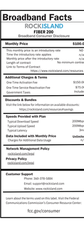 Broadband services and characteristics Rock Island provides broadband internet access (BIA) services to our customers over a number of different network technologies, which provide different levels of performance. Fiber-To-The-Home (FTTH) Fixed Wireless Broadband Wifi Our Fiber To The Home (FTTH) offering provides a number of symmetrical speed profiles ranging from 100Mbps bidirectional all the way up to bidirectional 2Gbps. For those who are unable to take advantage of the benefits of our all fiber network, we offer Internet access over Fixed Wireless and Wifi at speeds up to 200Mbps down, and 25Mbps up. With Fixed Wireless, many factors affect the speed and performance that customers experience, including the programs running on the device, proximity to a cell site, the capacity of the cell site, the surrounding terrain, use inside a building, radio frequency interference, how many other customers are attempting to use the same spectrum resources. Even within coverage areas – network changes, traffic volume, outages, technical limitations, signal strength, obstructions, weather, and other conditions may impact speeds and service availability. Network Management for Congestion Rock Island does not selectively manage congestion on the network through methods such as real-time throttling, blocking, or dropping of specific end user traffic based on source or content. There are no download or upload volume usage caps applicable to any of Rock Island’s retail BIA services. Q: How does the current congestion management work? A: The current congestion management techniques are very basic. All internet data traffic is considered “best effort”, and is therefore subject to congestion management processes. The actual techniques will use a combination of buffering and “first in first out” tools to accomplish the goal of lessening the impact caused by the congestion. Selection of traffic to delay during times of congestion will be completely random and all customer traffic regardless of their bandwidth usage or network application will be equally subject to the same factors of randomization. Q: Does the congestion management target peer-to-peer (“P2P”) or other applications, or make decisions about the content of my traffic? A: No. The technique is “protocol-agnostic,” which means that the system does not manage congestion based on the applications being used by customers. It is also content neutral, so it does not depend on the type of content that is generating traffic congestion. Said another way, customer traffic is congestion-managed not based on the applications or content being used, but based on current network conditions and recent amounts of data transferred by users. Q: How does the congestion management impact me and my use of Rock Island’s Internet service? A: Being protocol-agnostic customers will most likely not notice a change in their Internet experience. The goal of congestion management is to enable all users to have access to a fair share of the network at peak times even if congestion should occasionally occur. Congestion management focuses on the consumption activity of the network as a whole whereby everyone is impacted the same. In fact, our FTTH customers are rarely if ever affected because of our bandwidth capabilities. Q: How often does Rock Island expect to use any congestion management processes? A: Based on our experience, network performance congestion is not common. Rock Island monitors how user traffic is affected during high usage periods and would make the adjustments reasonably necessary to ensure that our Internet customers have a high-quality online experience. Rock Island also routinely evaluates its overall network performance and periodically enhances its network by adding capacity which continues to alleviate possible network congestion. Q: Does this congestion management process apply to both Commercial and Residential services? A: Yes. Q: Does Rock Island block P2P traffic or applications like BitTorrent, Gnutella, or others? A: No. Rock Island does not block P2P traffic or applications like BitTorrent, Gnutella, or others as part of network congestion management. Q: Does Rock Island discriminate against particular types of online content? A: No. Rock Island provides its customers with full access to all the lawful content, services, and applications that the Internet has to offer. Network Security Practices Q: Does Rock Island employ network security practices in addition to the congestion management processes? A: Yes. Rock Island employs a number of practices to help prevent unwanted communications such as spam as well as protect the security of our customers and network. In order to further protect our customers, Rock Island blocks a limited number of ports that are commonly used to send spam, launch malicious attacks, or steal a customer’s information, for example. In addition, Rock Island conducts several security initiatives, and offers security tools for our customers. Device Attachment Customers may attach devices of their choice to the modem provided by Rock Island. Any attached devices must be used in a manner consistent with our Terms of Service and Acceptable Use Policy. Network Privacy Protection Q: How does Rock Island protect the privacy of information received from customers and 3rd parties? A: Occasionally traffic may be inspected for trouble shooting purposes. This information may be stored for short periods during the trouble analysis and then discarded. The only information provided to third parties would be information given to law enforcement after the proper subpoenas and other documents are provided. For more information, view our Privacy Policy. Network Performance Factors Q: What are the factors for determining performance for a Broadband Provider? A: Rock Island provisions its network to ensure that its customers can enjoy the speeds to which they subscribe. However, Rock Island does not guarantee that a c